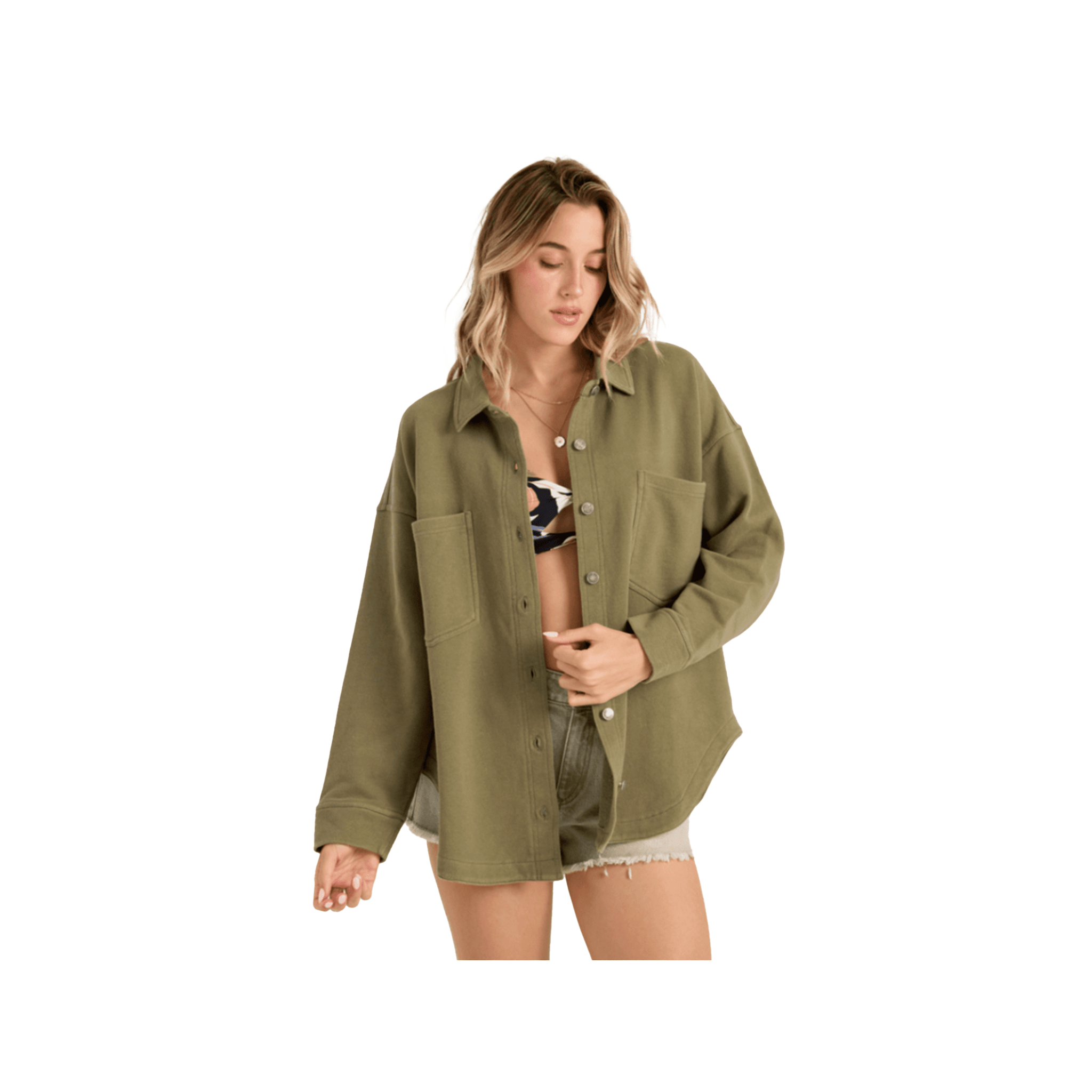 Soft like your favorite hoodie, built like a jacket—the Nollie is an oversized washed French terry shirt jacket in Bayleaf that keeps it casual and on point. Made from 100% cotton, this easy layer features a loose drop-shoulder fit, button front, and roomy patch pockets. Perfect for everything from coffee runs to curb sessions, it's the versatile piece that bridges comfort and style.
